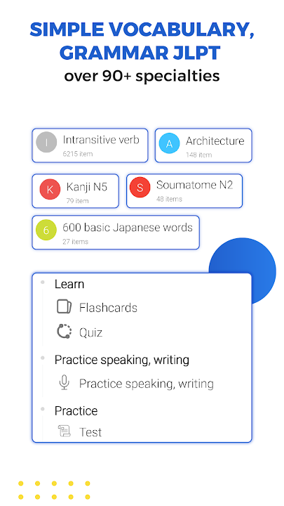 - Support learning through features such as flashcards, listening, speaking, writing, word matching,..,