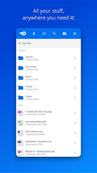 MediaFire lets you easily upload all your files - like your photos, videos, music, and documents - and access them from anywhere with your phone, tablet, computer, or the web!
