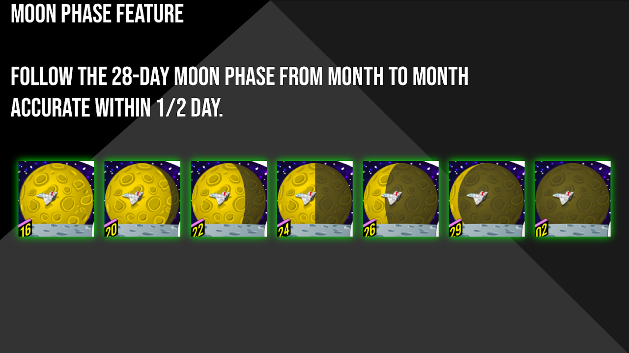 - A true 28 day Moon Phase graphic displayed on the big moon in the background accurate within +/- half a day. Watch for it’s daily changes as the month goes on!