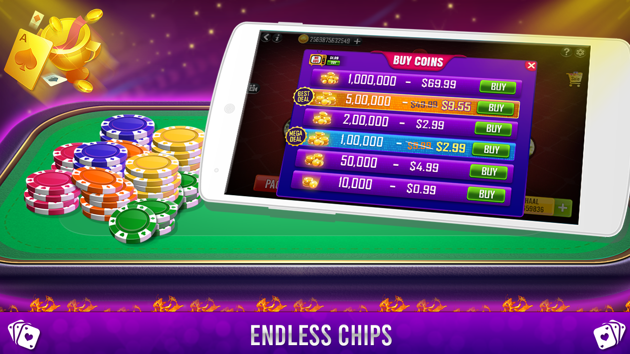 Teen Patti (Indian Poker) is a 3 card game. THIS IS NOT A REAL MONEY GAME!