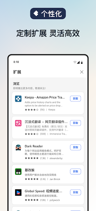 全新上线的扩展功能,让您可以轻松解锁音视频一键加速、网页双语对照、Cookie 高效管理、网页主题自由定制、视频沉浸式观看等更加灵活个性化的浏览体验。