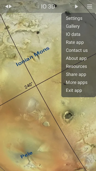 IO 3D 讓您以高解析度輕鬆探索 IO(木星的伽利略衛星之一)的整個表面。要查看活火山或仔細觀察其山脈或地區,只需點擊左側選單,您就會立即傳送到相應的座標。 IO 是太陽系第四大衛星,主要由矽酸鹽岩石和鐵構成。圖庫、冥王星資料、資源、旋轉、平移、放大和縮小代表您可以在這個漂亮的應用程式中找到的額外頁面和功能。