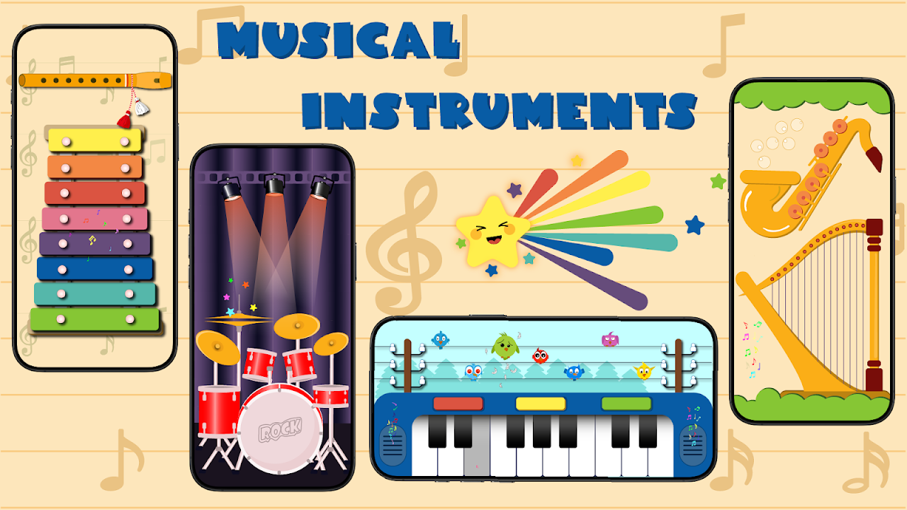 ✔ Musical instruments: piano, xylophone, drums, harp, saxophone, flute - all the sounds of real and high-quality instruments, reveal the musical potential of your baby.