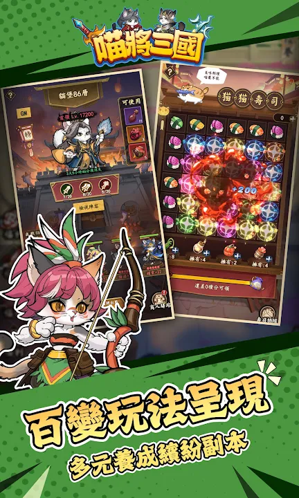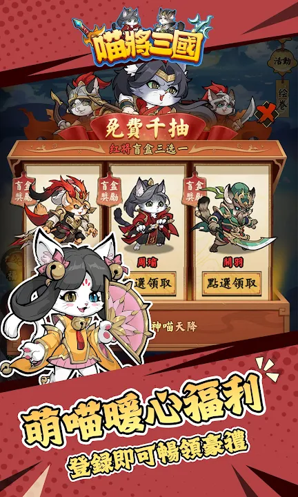 加入《喵将三国》让你的小投入收获满满回报!通关免费领取千抽福利!连续七日登录,更有红色顶级猫将任你挑选,助你在三国乱世中所向披靡!