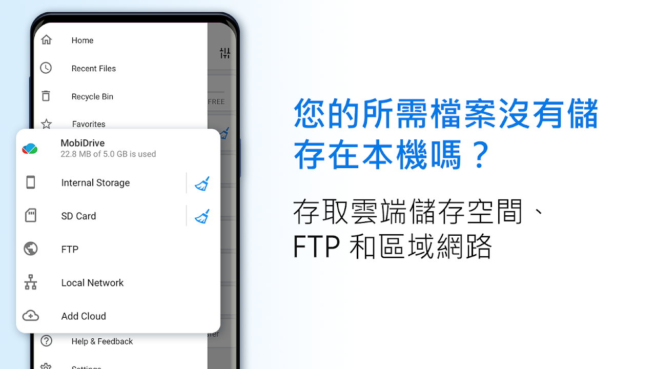 File Commander 配有 5GB 免費 MobiDrive 雲端儲存空間(付費版為 50GB),我們的雲端儲存空間不僅可提供輕鬆檔案和資料夾共用功能,還可在即使沒有網際網路連線時使用的智慧離線功能存取 MobiDrive 檔案。