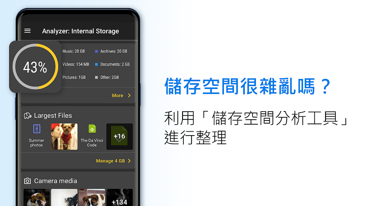 「儲存空間分析工具」將可助您清理雜亂的儲存空間,同時為重要應用程式和檔案釋放所需空間,透過可視介面,呈現佔用最多空間的物件,並建議要刪除或移動到其他儲存位置的檔案。