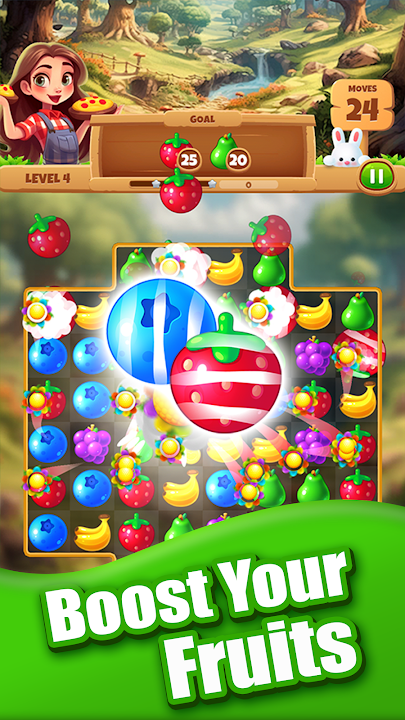 Welcome to "Fruit Quest: Match 3," a delightful game that combines the excitement of a match-3 puzzle with the enchanting ambiance of a fairy tale.