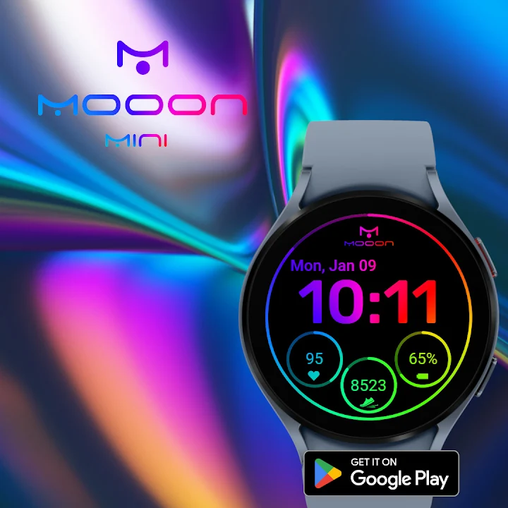 Multicolored watch face with digital clock, date, step counter and heart rate monitor for Wear OS.