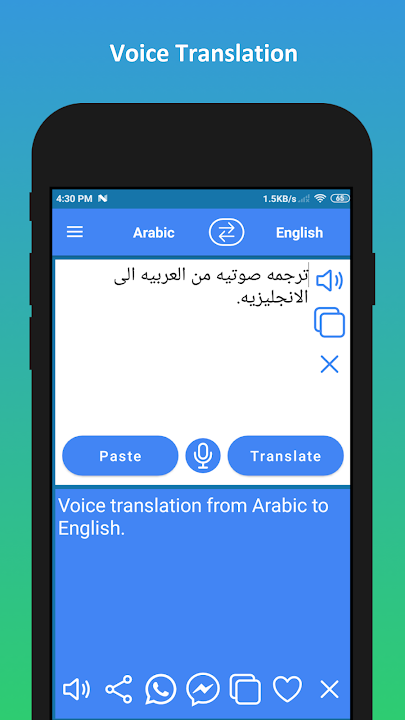 ✓ Using inbuilt voice recognition technology, you can type your text using your voice and then translate the text. This convenient feature allows you to translate regular conversations. You can translate your Arabic voice to English and English voice to Arabic.