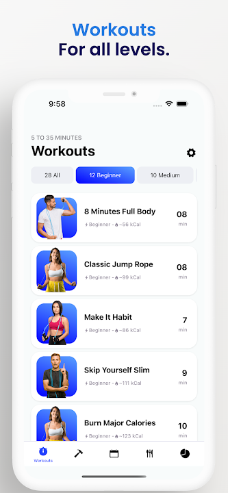 Jump Rope Challenge App 锻炼围绕跳绳和体重锻炼的不同组合而构建,可帮助您燃烧卡路里、增强力量并提高耐力。锻炼时间为 5 到 30 分钟。