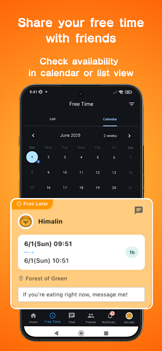 Let friends know when you're open by registering your schedule. View others' open times in a calendar or list view, with privacy controls.