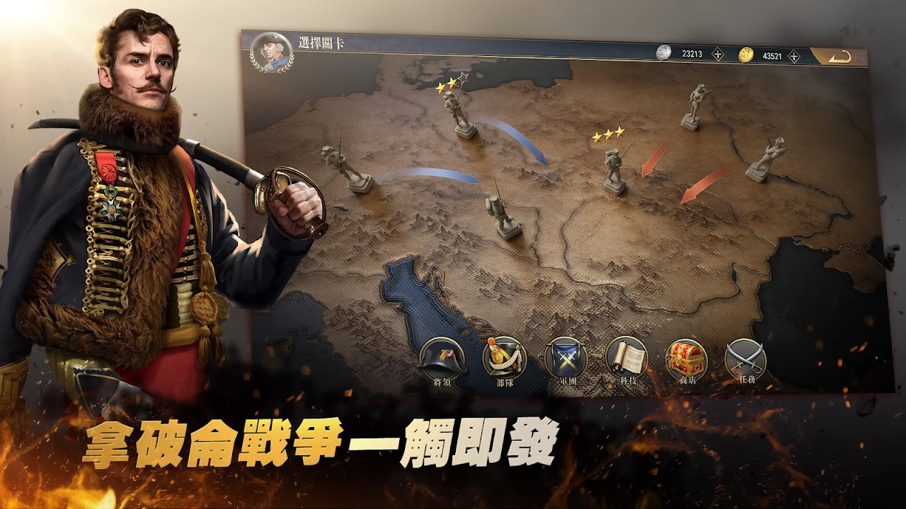 • 10 個章節,60 多個著名戰役,100 個國家和軍隊。基於歷史戰爭的引人入勝的故事,包括馬倫戈戰役、滑鐵盧戰役、特拉法加戰役、萊比錫戰役,帶你回到拿破崙的歐洲戰爭。