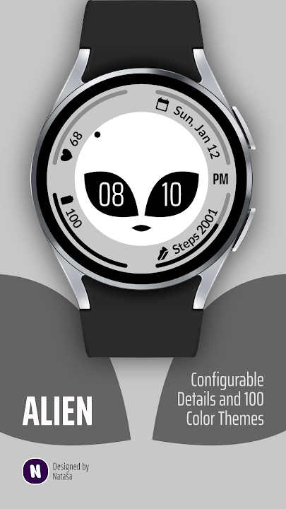 The Alien watch face for Wear OS is a fun and functional watch face that combines an alien theme with time and essential information from four configurable complications slots like date, battery level, heart rate, and step count.