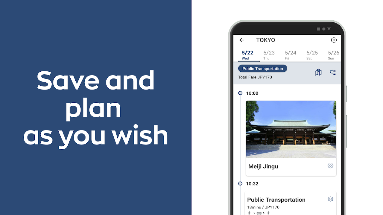 -Create your own travel plan with your favorite spots by adding them in a timeline. Your plan can also be viewed on a map.