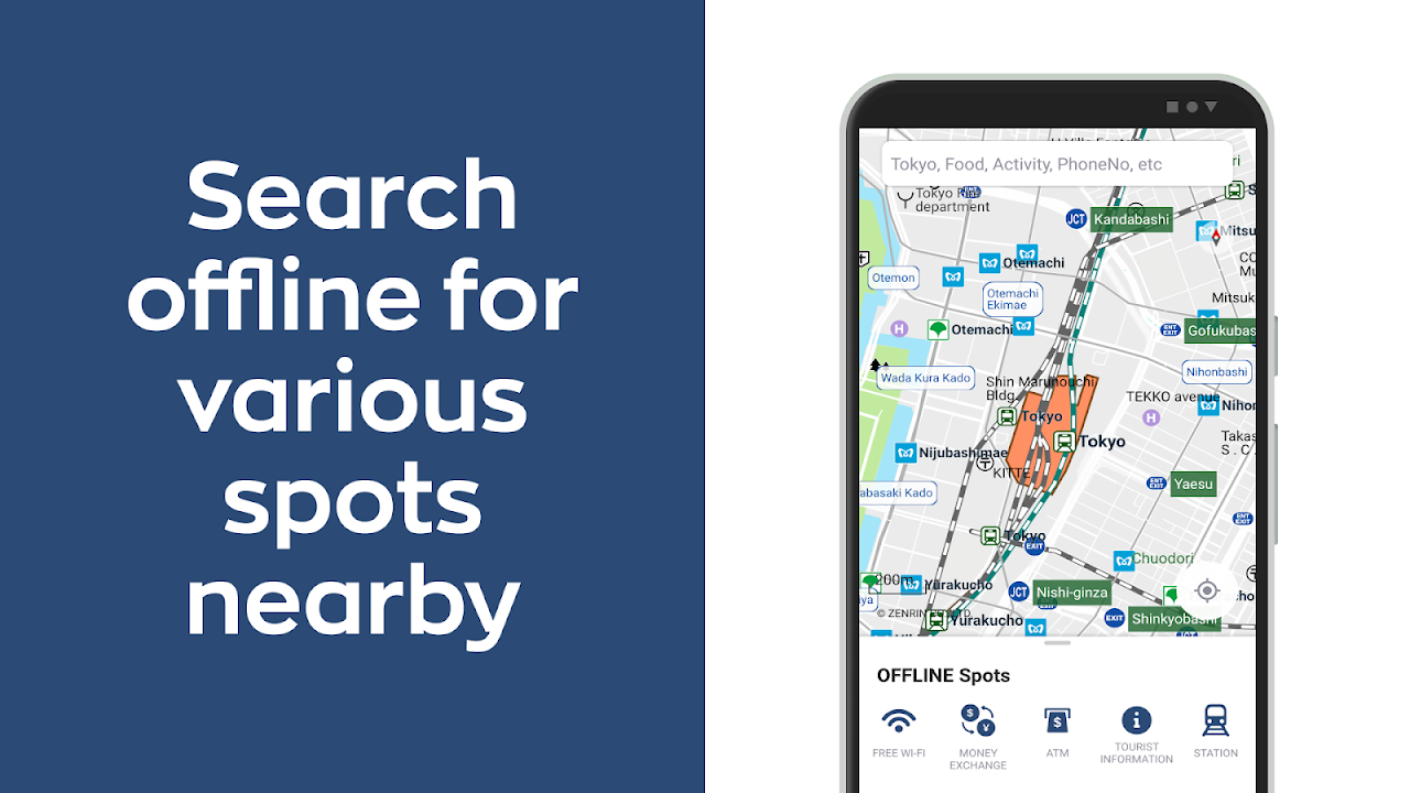 -Search offline for the following spots: Free Wi-Fi hotspots (NTT FREE Wi-Fi, FREESPOT, Starbucks, etc.), currency exchange spots, ATMs, TICs, and train stations.