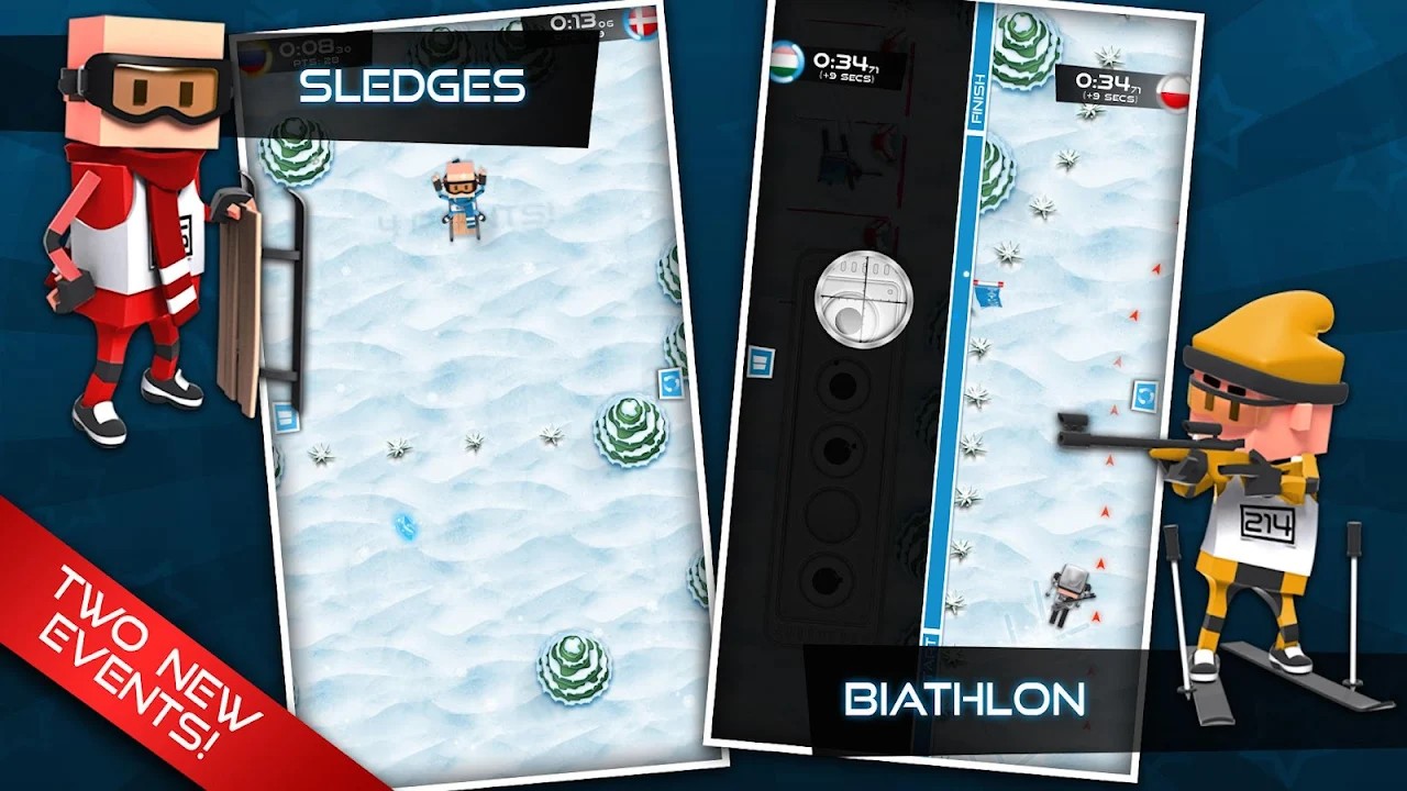 在八项冰上运动中一试身手,包括障碍滑雪、滑冰、跳台滑雪、冰球、冰壶、打雪仗、冬季两项和雪橇。