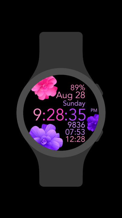 A beautiful pink purple flowers watch face for Wear OS smartwatches