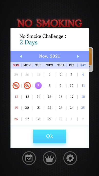 [抽烟]如果你还不能忍受香烟,请按下吸烟按钮,用虚拟香烟来增加肺活量。[不能吸烟]通过单击“禁止吸烟”按钮,您可以在戒烟日历上查看出勤情况。填写戒烟日记。