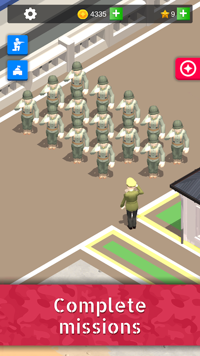 Become an army general and profit from your troops by managing your army base game like a tycoon. It’s a rollercoaster ride - no need to tap and tap or click and click - just invest, train your troops and win wars.