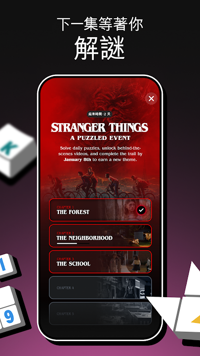 透過特別設計的謎題庫來保持你的思緒敏捷,感受 Netflix 影集與電影的奇幻魅力,《KPop 獵魔女團》、《魷魚遊戲》,以及《怪奇物語》全都收錄在裡頭。每天打開此應用程式或 Tudum.com,都能挑戰全新謎題,展開屬於你的傳奇解謎連勝之旅。