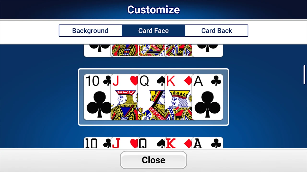 • Customization: Change your background, card backs and card faces for a personalized experience.