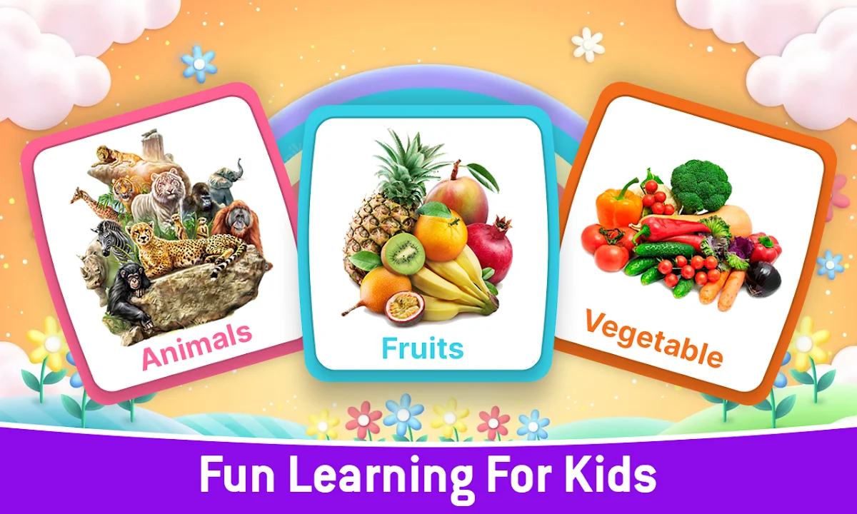 應用程序中包含的各種類別,例如水果,蔬菜,動物,顏色,形狀,花朵,字母,數字,乾果,鳥類,月份,工作日,交通,職業,食品,文具,指示,身體部位,運動,節日,樂器,自然,季節,國家等等。 “孩子們多合一”應用程序剛剛將學習從教室轉變為家庭。