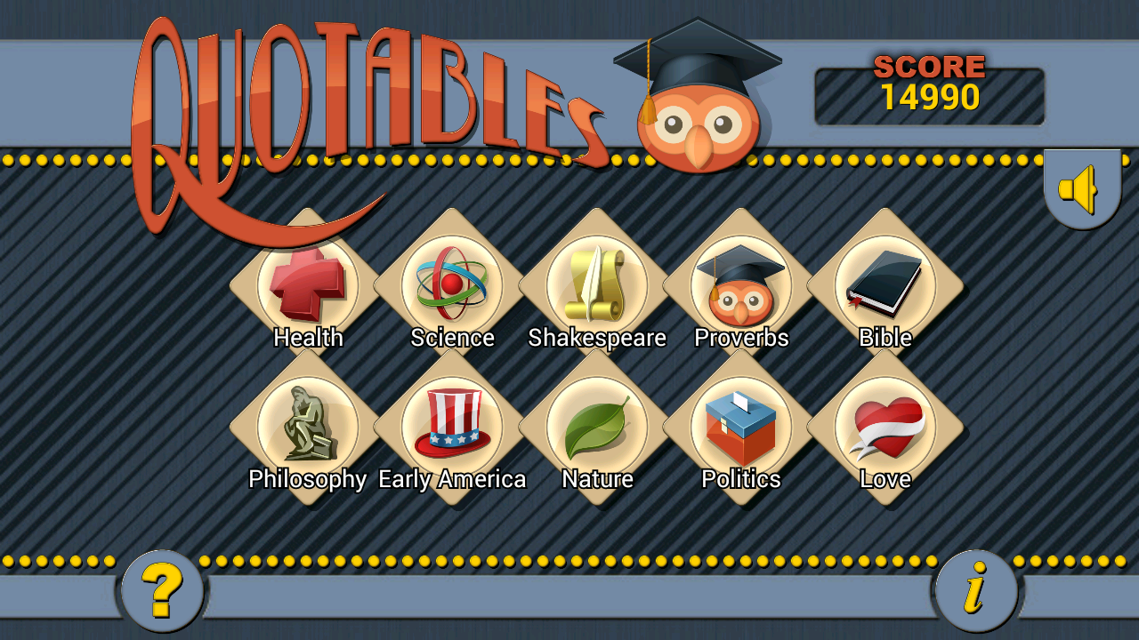 Quotables是一個輕鬆的文字遊戲,您可以識別和組裝亂序報價。每個單詞拼圖都包含一個著名的說法,拼寫在板上用字母拼貼。然後在板上的每列內垂直地對字母拼貼進行混洗以對字進行加擾。您必須重新排列每列中的圖塊,以正確的順序連接字母並恢復原始說法。