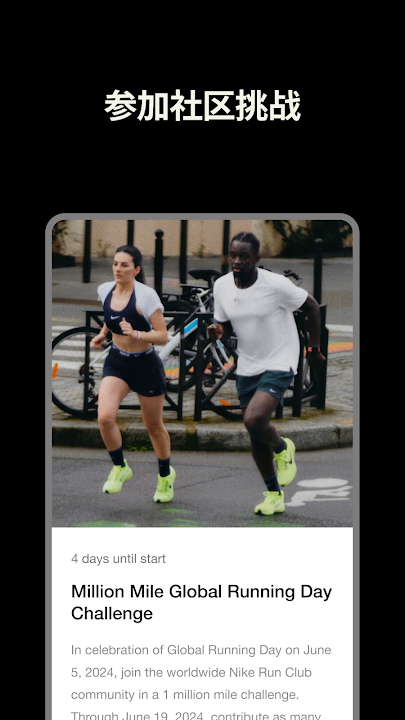 加入 Nike 跑步者全球社区,参与每周和每月距离挑战,也可以自行创建挑战,然后邀请朋友一同参与。完成目标,赢取成绩单,自由畅跑。
