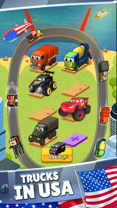 Play Monster Truck Games! Drive across America and all over the world! Merge trucks, monster trucks and semi trucks - let them race to earn money. What is the main goal of the game? Merge to lvl 50 and become idle trucker! Monster trucks and other cars waiting for best truck driver. Relax and have a lot of fun. Let your lorry race!