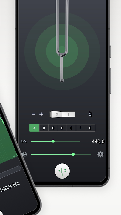 For those who prefer to manually tune their instrument, the 'Diapason' view lets you play a reference tone, 'A' (440 Hz) or any other note that you can select by moving the frequency slider.