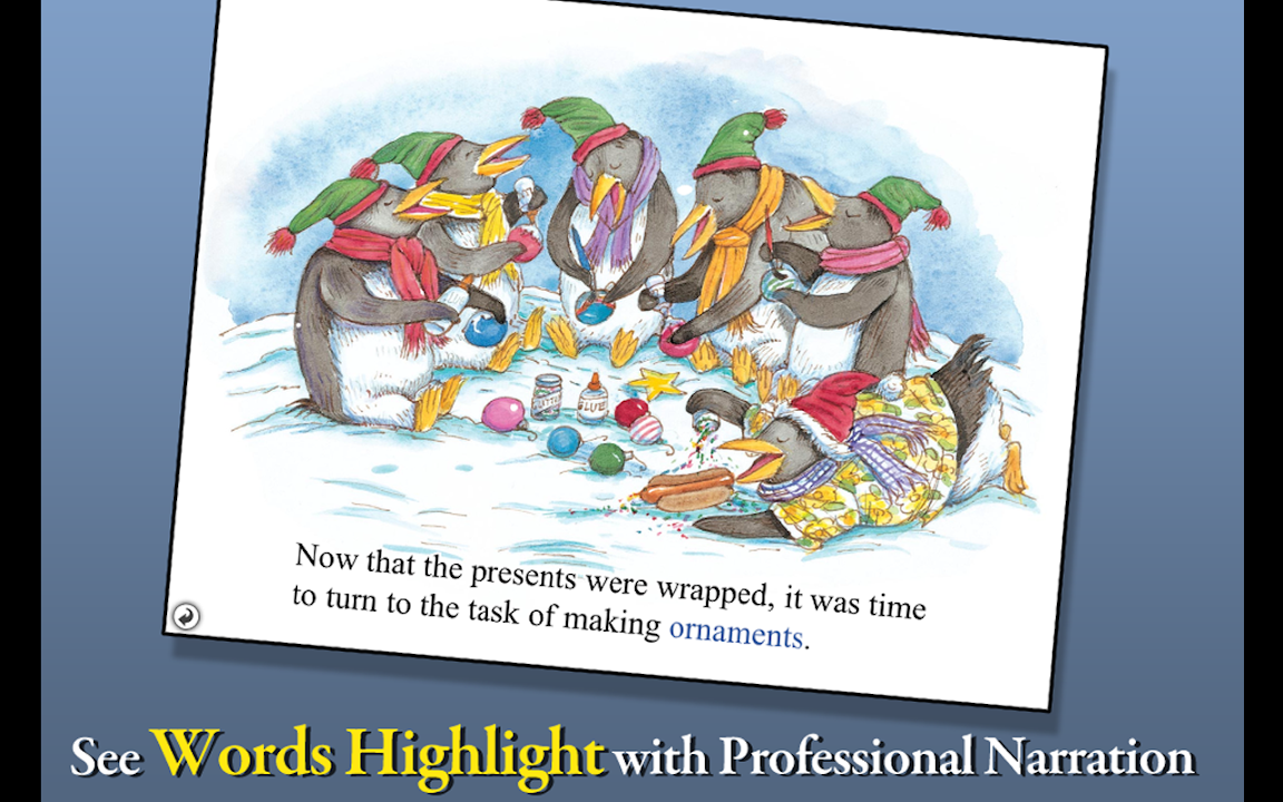 Join the penguins Tacky, Goodly, Lovely, Angel, Neatly, and Perfect in this interactive book app as they celebrate Christmas with good cheer, singing, and lots of presents! Explore pictures, learn new vocabulary, and follow along with three fun ways to read! When the Christmas merrymaking is interrupted by hunters in search of pretty penguins, how will Tacky's unusual gift save the day?