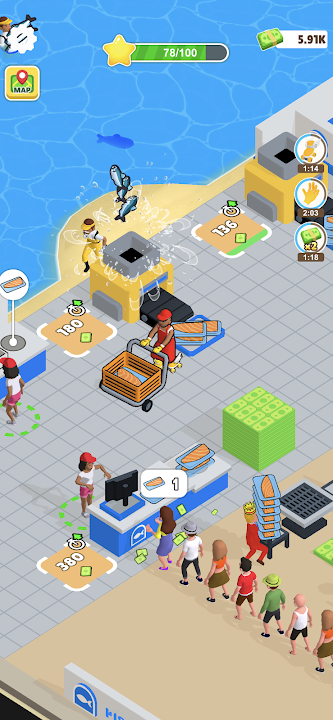 我們也提供得來速服務,因此請確保有效率地處理這些訂單。賺錢並用它來僱用更多員工並擴大您的餐廳。目標成為美國第一的海鮮餐廳!