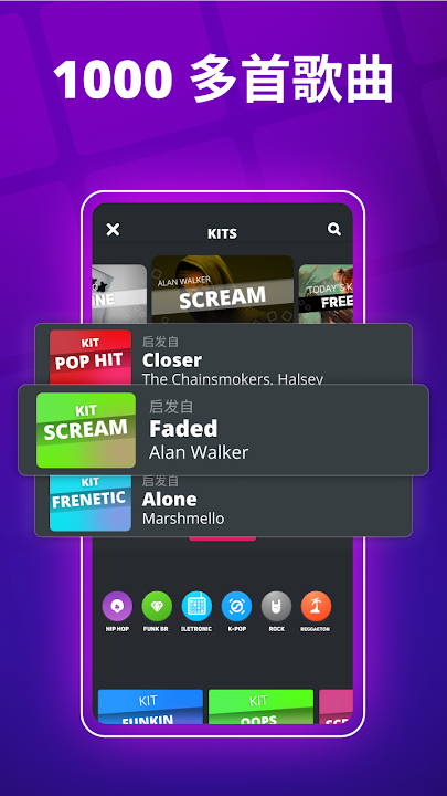您无需成为专业 DJ 即可使用 Super Pads - 任何人都可以通过此应用程序成为节拍制作者。这些套件的灵感来自著名的曲目,具有预定义的节拍和循环。播放著名的热门歌曲,如 DJ Alan Walker 的 Faded 和 Alone,以及 DJ Martin Garrix、Marshmello 等。