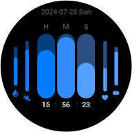 - 電池進度指示器、每日步數目標計數、每日燃燒卡路里目標、心率、經過的小時、分鐘和秒數