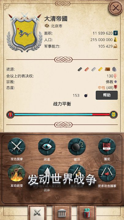 一个有远见的独裁者是国家政策成功的基础。请保持积极的国际活动,签署不侵略协议,将重要问题纳入国际投票。请记住,外交和周到的政策往往是比战争更有效的联盟。您不要忘记国家的经济活动:为您的军队生产食品,衣服,武器和其他装备。