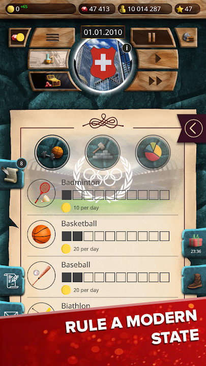 Manage various ministries to make life of your citizens better and safer: police, security service, Ministry of Health, Education, Defense, Infrastructure, Sport, Culture, environment, housing and utilities infrastructure and so much more! You control all the aspect of your country’s life