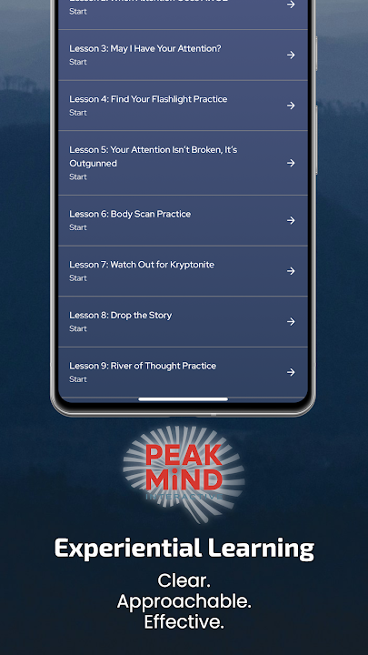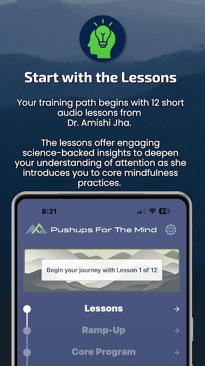 The app features 12 immersive audio lessons that bring the brain science of attention to life, guiding you step by step through foundational mindfulness practices. You’ll then build a mindfulness habit with the Ramp-Up feature and then dive into the 4-week Core Program—a structured, time-efficient training regimen designed to exercise your attention from every angle.