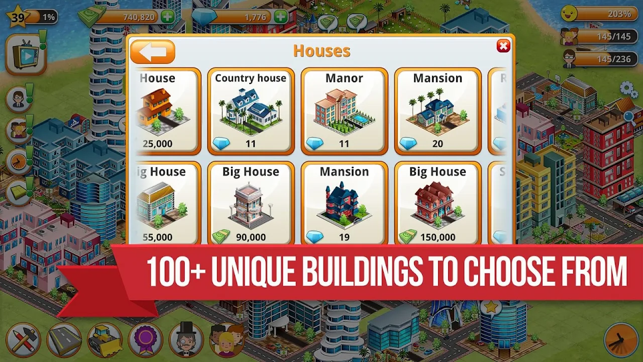 - Unlock and build from a list of 100+ Unique buildings (residential, commercial, farm, community, decoration, park, plants, beach and sea buildings like oil platforms and more)