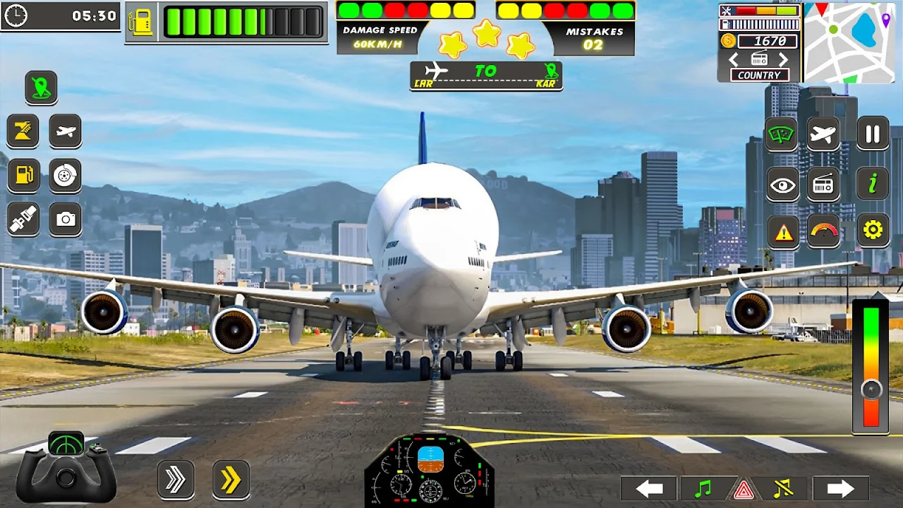 在速度和空氣煞車之間建立平衡,以在飛行員模擬器 - 航空遊戲中執行平穩著陸。透過飛行模擬器中的飛行雷達遵循真實的著陸程序,以安全地降落在真實飛機遊戲的跑道上。使用飛機模擬器- 航空遊戲2024 中的各種工具自訂您的飛機。飛行模擬器中控制飛行時的每種情況。