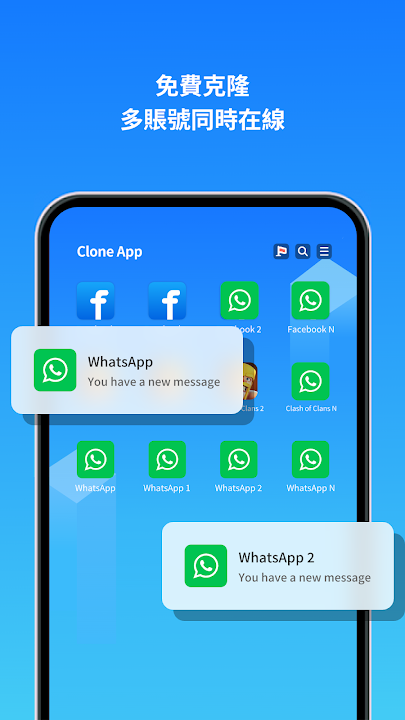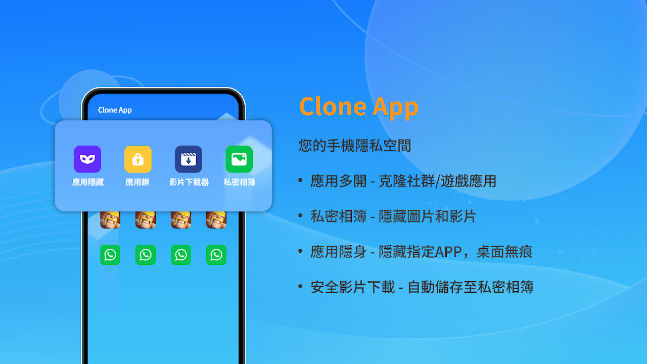 Clone App 又叫 XClone App,是一個應用程式複製器/隱私空間(隱藏APP)。採用Android虛擬化技術建構的平行空間/雙開空間(dualspace)。可以複製社交/遊戲應用程式,例如 WhatsApp Clone、Facebook Clone、Instagram Clone、Messenger Clone、dual whatsapp、double app、second whatsapp 等,在一部手機上實現同時管理和運行多個帳號,還能隱藏應用/遊戲,保護您手機的個人隱私。