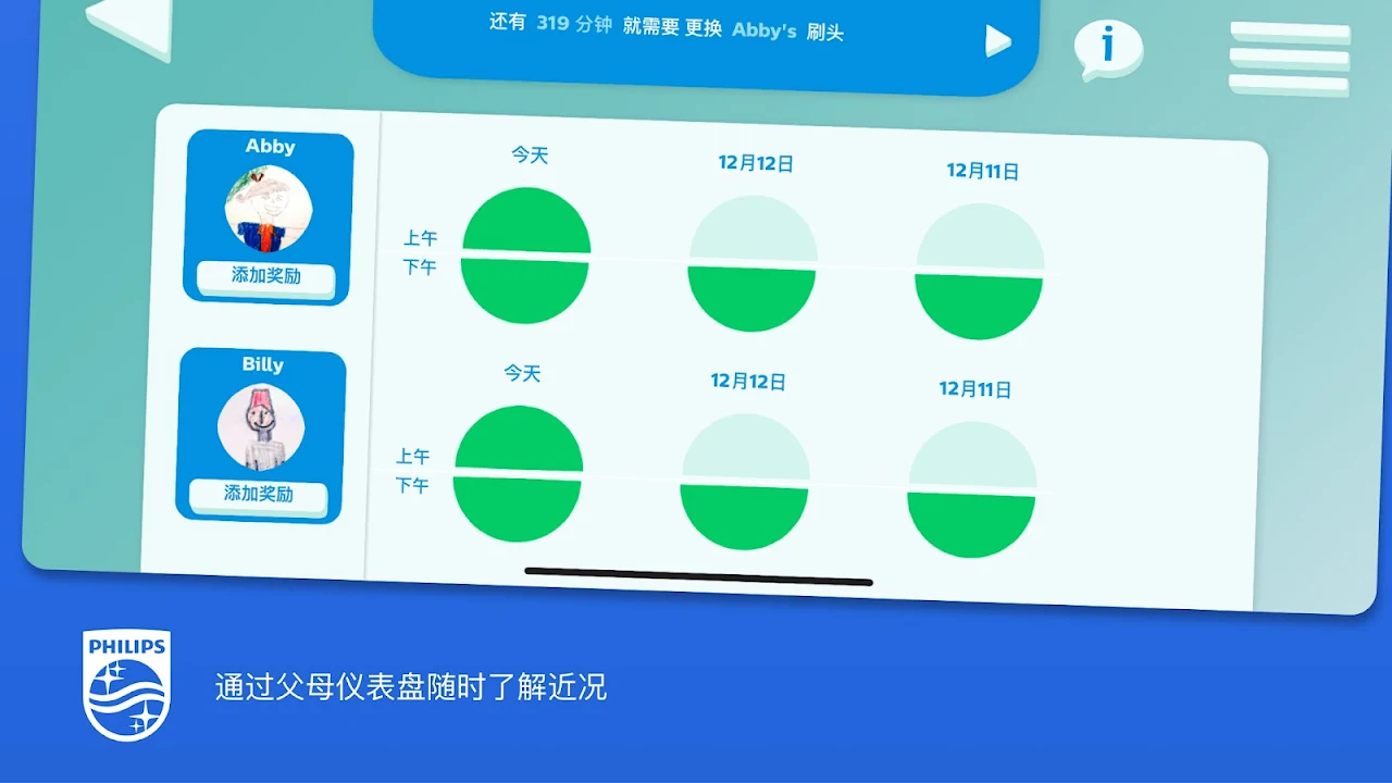 家长优势 — 可通过以下功能随时查看孩子们在培养刷牙习惯方面的最新表现: