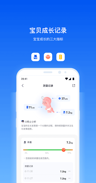 你可以通过PICOOC APP记录婴儿成长过程中的身体数据,包含体重、头围、身长等数据,PICOCC会通过你所记录的数据,为你分析婴儿的成长情况。