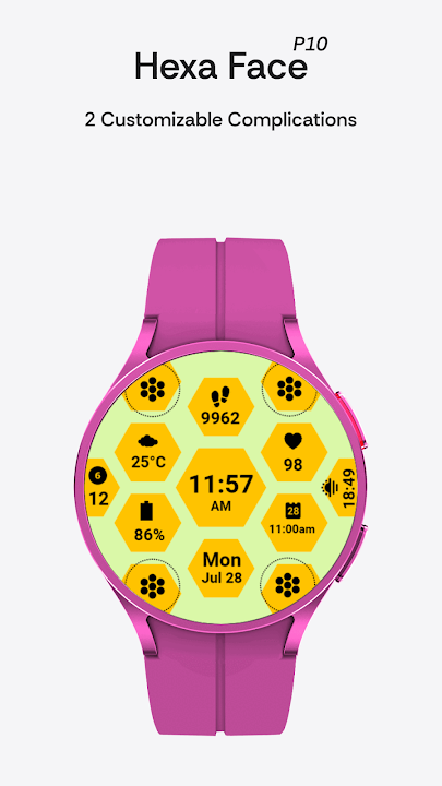 Stylish hex watch face with live data, shortcuts, and customization.