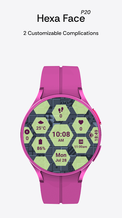 Stylish hex watch face with live data, shortcuts, and customization.