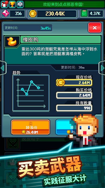 运用你在股海投资多年的经验,投资有潜力的企业和炒卖黑市资源。从图表中预测市场趋势,或让你的手下帮助你进行交易,目标是 - 再次成为亿万富翁!随着你的成长,你会得到粉丝的鼓励,并收到免费的礼物,邪恶世界就是令人如斯著迷!