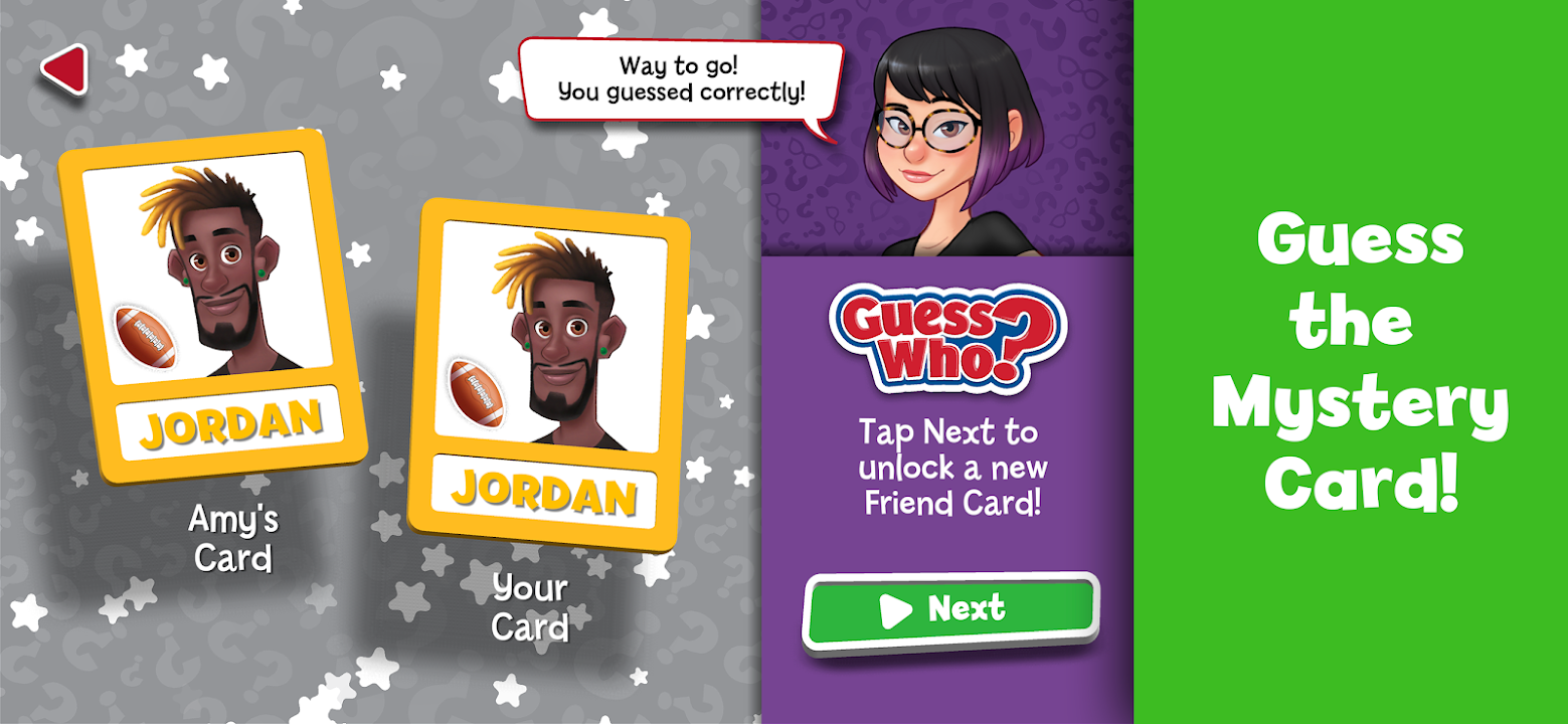 In the GUESS WHO? app, you get to play with each of the 6 classic characters from the board game – Amy, Al, Sofia, Sam, Emma and Jordan - as you try to guess the mystery character using yes or no questions. Do they have brown hair? Do they wear glasses? Do they like sports? Remove cards that don’t match through process of elimination. When you think you know the correct card, makes a guess! The more you more play, the more character cards you will discover. Enjoy fun facts and inspirational messages as you make your way through the app.
