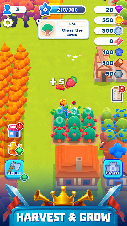 🎮 Idle aspect – While you’ll need to use your noggin to figure out the best methods for harvesting strawberries and mining rocks, the game’s idle aspect keeps this fun and chill. Soon you’ll have tons of workers at your beck and call, ready to build, defend, and harvest for their leader. But don’t worry, any time you want to take a little break from the action and take part in the harvest, you’re more than welcome!