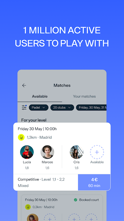 探索 Playtomic,這款應用程式可將您與一個由超過 100 萬板球、網球和其他球拍運動玩家組成的不斷增長的社群聯繫起來。透過我們專為您設計的直覺且易於使用的應用程序,享受獨特的體驗。