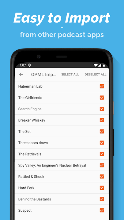 You can quickly transfer subscriptions from other podcast apps to our app by using OPML Import feature.
