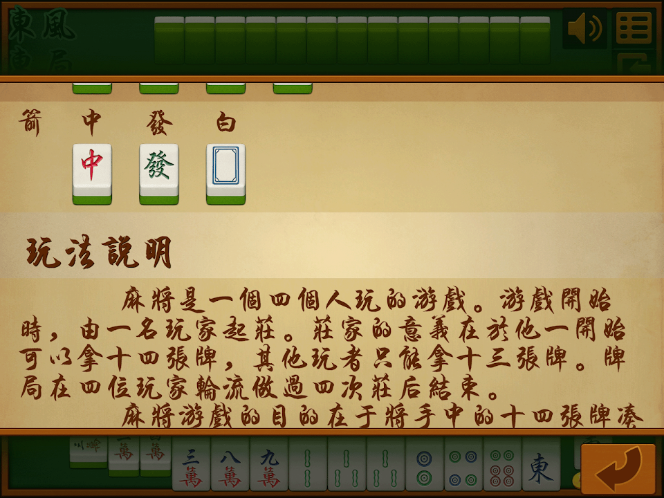 國標麻將13張是一款經典的四人麻將遊戲,採用國標規則,操作簡單,流暢穩定,遊戲內有詳細的幫助文檔和出牌提示功能,可以教會你怎麼打麻將。可以存檔。離線可玩。
